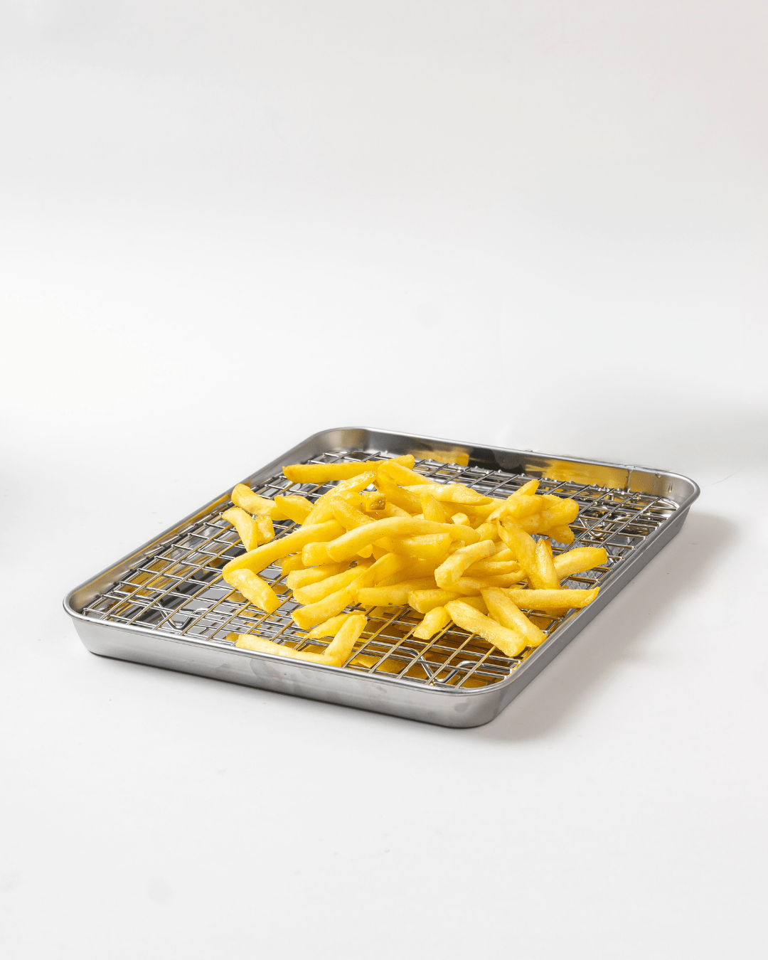 the food, like fries, place it on the tray rack to let the excess oil drain. Then, start seasoning the fried food while it's on the rack, allowing the seasoning to absorb as well.